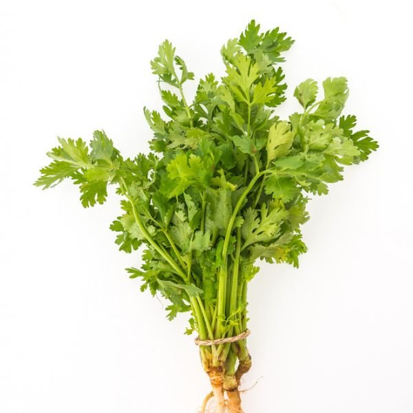 Coriander leaves (cilantro) are fresh, aromatic, and rich in vitamins A, C, and K, supporting digestion and immunity.